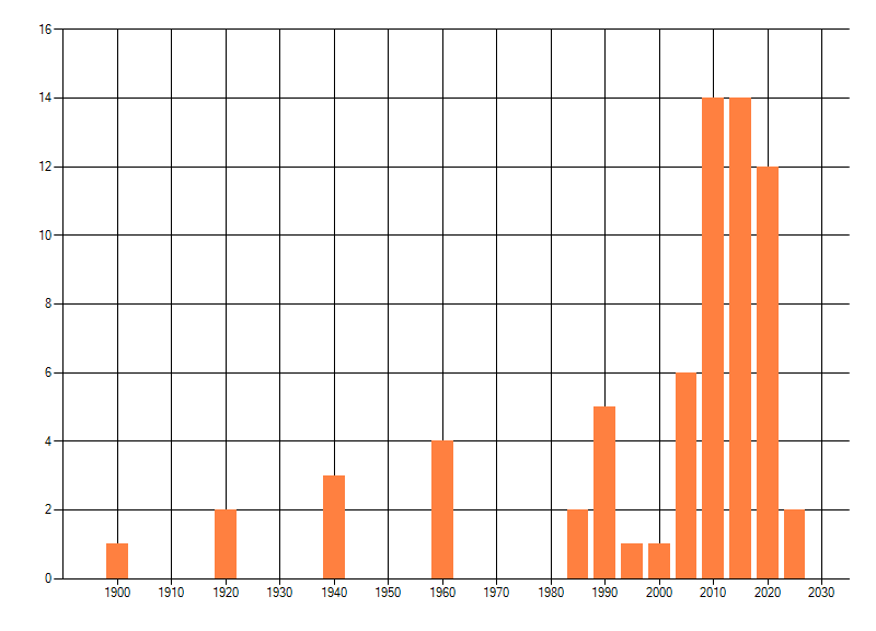 Het aantal atlasblokken (5x5 km) waarin de soort is gemeld binnen een periode van vijf jaar (vanaf 1980) of twintig jaar. Niet gecorrigeerd voor waarnemersinspanning en het aantal doorgegeven waarnemingen kan sterk variëren per periode, dus een trend in verspreiding kan hier niet direct uit worden afgelezen. Het opgegeven jaartal is het eerste jaar van de periode. Bron: gevalideerde waarnemingen uit de NDFF.