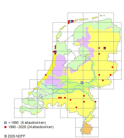 Het aantal atlasblokken (5x5 km) waarin de soort is gemeld binnen een periode van vijf jaar (vanaf 1980) of twintig jaar. Niet gecorrigeerd voor waarnemersinspanning en het aantal doorgegeven waarnemingen kan sterk variëren per periode, dus een trend in verspreiding kan hier niet direct uit worden afgelezen. Het opgegeven jaartal is het eerste jaar van de periode. Bron: gevalideerde waarnemingen uit de NDFF.