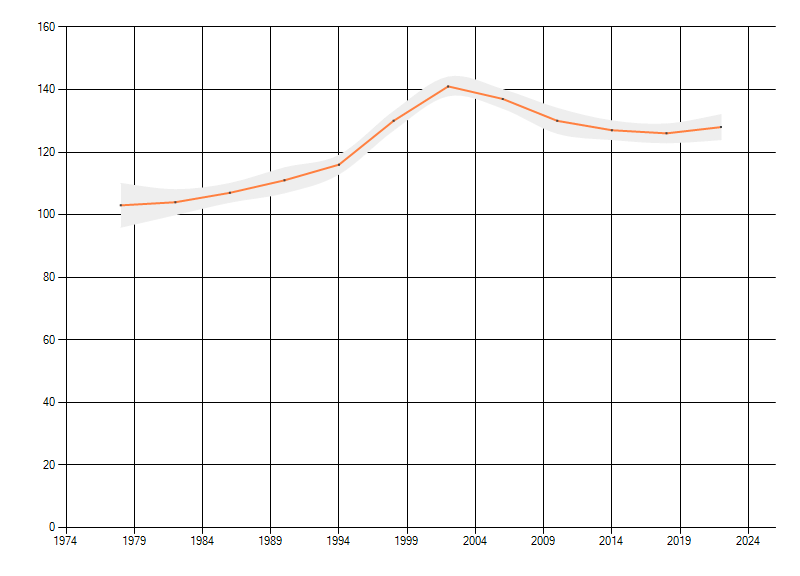Gemiddelde trend van het aantal kilometerhokken waarin de soort voorkomt, weergegeven als indexcijfer (1975-1978 = 100).