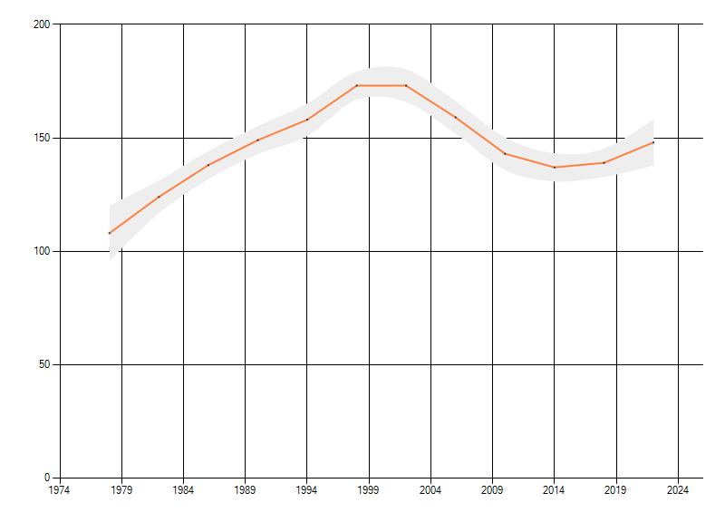 Gemiddelde trend van het aantal kilometerhokken waarin de soort voorkomt, weergegeven als indexcijfer (1975-1978 = 100). De trend is gecorrigeerd voor waarnemersinspanning en geeft de relatieve verandering in het aantal bezette kilometerhokken weer. Voor de berekening worden de data per periode van vier jaar samengenomen. In de grafiek correspondeert ieder punt met het laatste jaar van zo'n periode.