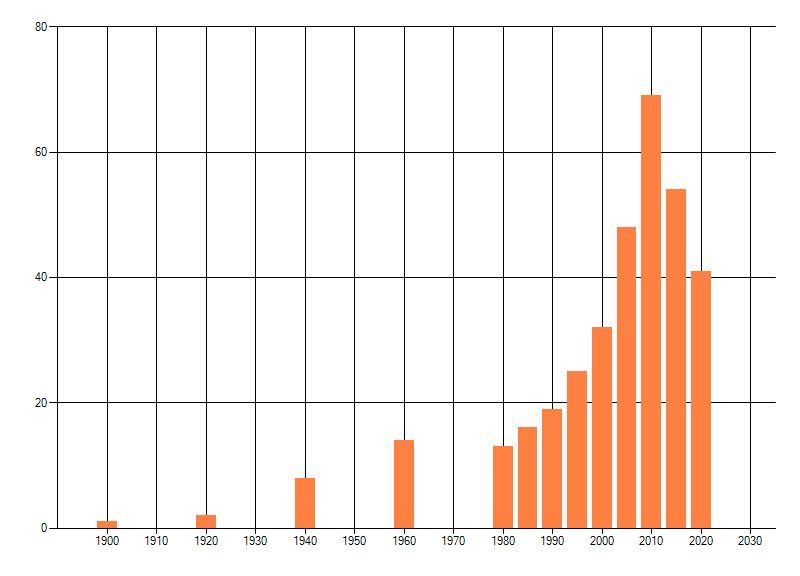 Het aantal atlasblokken (5x5 km) waarin de soort is gemeld binnen een periode van vijf jaar (vanaf 1980) of twintig jaar. Niet gecorrigeerd voor waarnemersinspanning en het aantal doorgegeven waarnemingen kan sterk variëren per periode, dus een trend in verspreiding kan hier niet direct uit worden afgelezen. Het opgegeven jaartal is het eerste jaar van de periode. Bron: gevalideerde waarnemingen uit de NDFF.