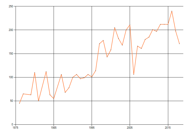 In de grafiek correspondeert ieder punt met het laatste jaar van zo'n periode.
