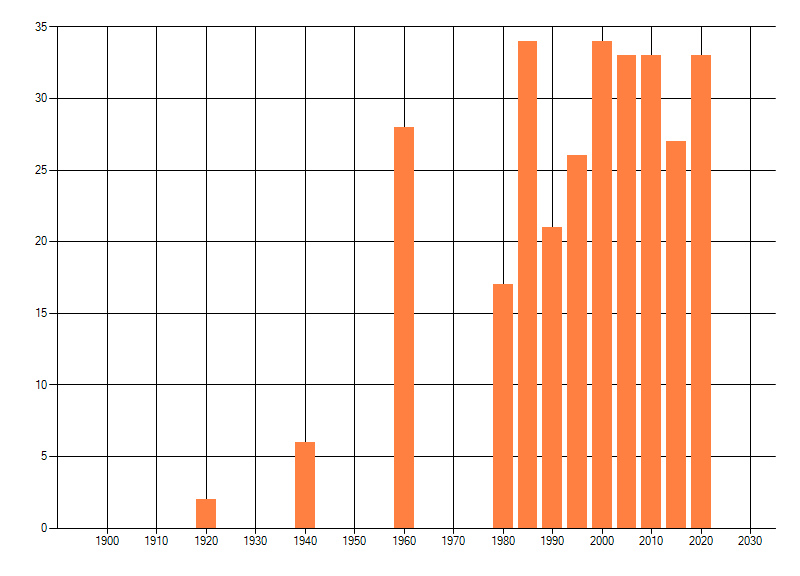 Het aantal atlasblokken (5x5 km) waarin de soort is gemeld binnen een periode van vijf jaar (vanaf 1980) of twintig jaar. Niet gecorrigeerd voor waarnemersinspanning en het aantal doorgegeven waarnemingen kan sterk variëren per periode, dus een trend in verspreiding kan hier niet direct uit worden afgelezen. Het opgegeven jaartal is het eerste jaar van de periode. Bron: gevalideerde waarnemingen uit de NDFF.