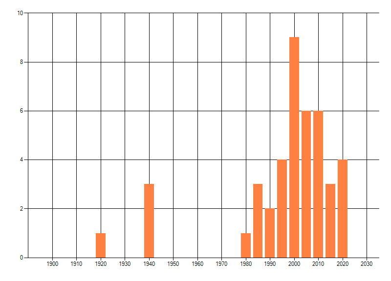 Het aantal atlasblokken (5x5 km) waarin de soort is gemeld binnen een periode van vijf jaar (vanaf 1980) of twintig jaar. Niet gecorrigeerd voor waarnemersinspanning en het aantal doorgegeven waarnemingen kan sterk variëren per periode, dus een trend in verspreiding kan hier niet direct uit worden afgelezen. Het opgegeven jaartal is het eerste jaar van de periode. Bron: gevalideerde waarnemingen uit de NDFF.