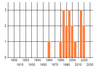 Het aantal atlasblokken (5x5 km) waarin de soort is gemeld binnen een periode van vijf jaar (vanaf 1980) of twintig jaar. Niet gecorrigeerd voor waarnemersinspanning en het aantal doorgegeven waarnemingen kan sterk variëren per periode, dus een trend in verspreiding kan hier niet direct uit worden afgelezen. Het opgegeven jaartal is het eerste jaar van de periode. Bron: gevalideerde waarnemingen uit de NDFF.