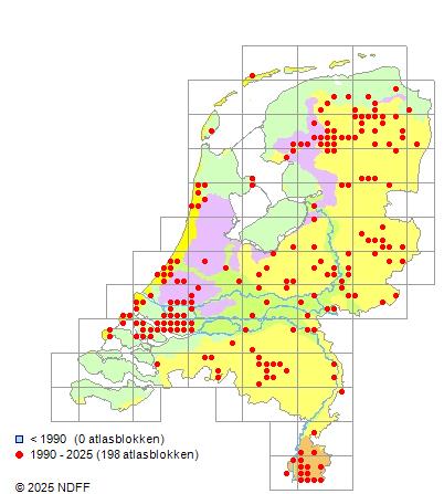 Het aantal atlasblokken (5x5 km) waarin de soort is gemeld binnen een periode van vijf jaar (vanaf 1980) of twintig jaar. Niet gecorrigeerd voor waarnemersinspanning en het aantal doorgegeven waarnemingen kan sterk variëren per periode, dus een trend in verspreiding kan hier niet direct uit worden afgelezen. Het opgegeven jaartal is het eerste jaar van de periode. Bron: gevalideerde waarnemingen uit de NDFF.