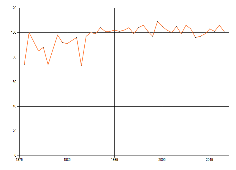 Gemiddelde trend van het aantal kilometerhokken waarin de soort voorkomt, weergegeven als indexcijfer (1975-1978 = 100). De trend is gecorrigeerd voor waarnemersinspanning en geeft de relatieve verandering in het aantal bezette kilometerhokken weer. Voor de berekening worden de data per periode van vier jaar samengenomen. In de grafiek correspondeert ieder punt met het laatste jaar van zo'n periode.