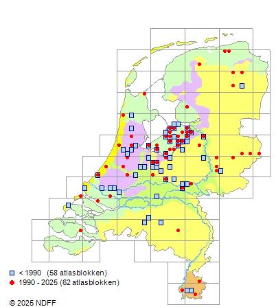 Het aantal atlasblokken (5x5 km) waarin de soort is gemeld binnen een periode van vijf jaar (vanaf 1980) of twintig jaar. Niet gecorrigeerd voor waarnemersinspanning en het aantal doorgegeven waarnemingen kan sterk variëren per periode, dus een trend in verspreiding kan hier niet direct uit worden afgelezen. Het opgegeven jaartal is het eerste jaar van de periode. Bron: gevalideerde waarnemingen uit de NDFF.