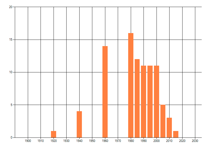 Het aantal atlasblokken (5x5 km) waarin de soort is gemeld binnen een periode van vijf jaar (vanaf 1980) of twintig jaar. Niet gecorrigeerd voor waarnemersinspanning en het aantal doorgegeven waarnemingen kan sterk variëren per periode, dus een trend in verspreiding kan hier niet direct uit worden afgelezen. Het opgegeven jaartal is het eerste jaar van de periode. Bron: gevalideerde waarnemingen uit de NDFF.