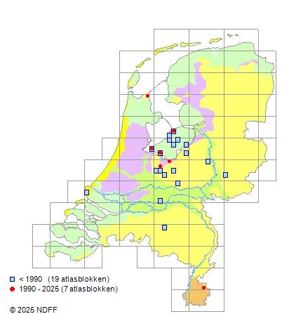 Het aantal atlasblokken (5x5 km) waarin de soort is gemeld binnen een periode van vijf jaar (vanaf 1980) of twintig jaar. Niet gecorrigeerd voor waarnemersinspanning en het aantal doorgegeven waarnemingen kan sterk variëren per periode, dus een trend in verspreiding kan hier niet direct uit worden afgelezen. Het opgegeven jaartal is het eerste jaar van de periode. Bron: gevalideerde waarnemingen uit de NDFF.