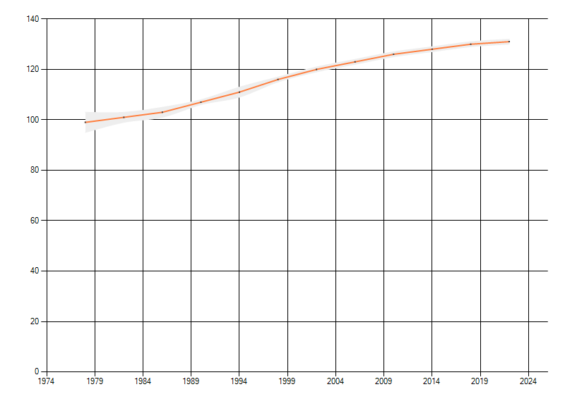 Gemiddelde trend van het aantal kilometerhokken waarin de soort voorkomt, weergegeven als indexcijfer (1975-1978 = 100).