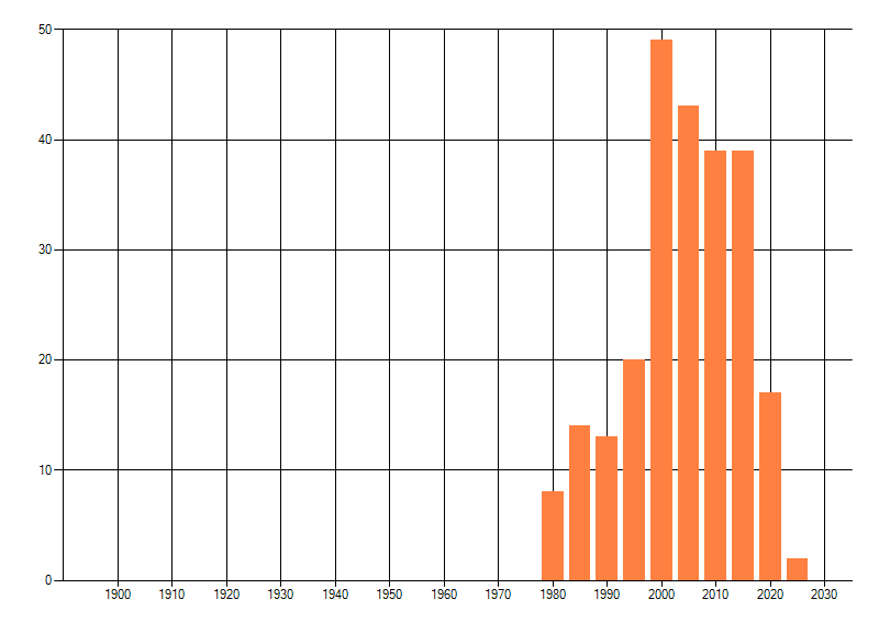 Het aantal atlasblokken (5x5 km) waarin de soort is gemeld binnen een periode van vijf jaar (vanaf 1980) of twintig jaar. Niet gecorrigeerd voor waarnemersinspanning en het aantal doorgegeven waarnemingen kan sterk variëren per periode, dus een trend in verspreiding kan hier niet direct uit worden afgelezen. Het opgegeven jaartal is het eerste jaar van de periode. Bron: gevalideerde waarnemingen uit de NDFF.