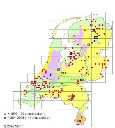 Het aantal atlasblokken (5x5 km) waarin de soort is gemeld binnen een periode van vijf jaar (vanaf 1980) of twintig jaar. Niet gecorrigeerd voor waarnemersinspanning en het aantal doorgegeven waarnemingen kan sterk variëren per periode, dus een trend in verspreiding kan hier niet direct uit worden afgelezen. Het opgegeven jaartal is het eerste jaar van de periode. Bron: gevalideerde waarnemingen uit de NDFF.