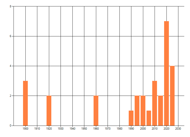 Het aantal atlasblokken (5x5 km) waarin de soort is gemeld binnen een periode van vijf jaar (vanaf 1980) of twintig jaar. Niet gecorrigeerd voor waarnemersinspanning en het aantal doorgegeven waarnemingen kan sterk variëren per periode, dus een trend in verspreiding kan hier niet direct uit worden afgelezen. Het opgegeven jaartal is het eerste jaar van de periode. Bron: gevalideerde waarnemingen uit de NDFF.