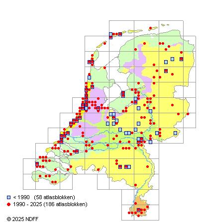 Het aantal atlasblokken (5x5 km) waarin de soort is gemeld binnen een periode van vijf jaar (vanaf 1980) of twintig jaar. Niet gecorrigeerd voor waarnemersinspanning en het aantal doorgegeven waarnemingen kan sterk variëren per periode, dus een trend in verspreiding kan hier niet direct uit worden afgelezen. Het opgegeven jaartal is het eerste jaar van de periode. Bron: gevalideerde waarnemingen uit de NDFF.