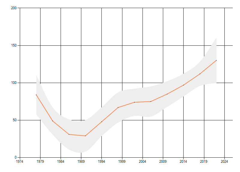 Gemiddelde trend van het aantal kilometerhokken waarin de soort voorkomt, weergegeven als indexcijfer (1975-1978 = 100).