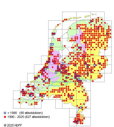 Het aantal atlasblokken (5x5 km) waarin de soort is gemeld binnen een periode van vijf jaar (vanaf 1980) of twintig jaar. Niet gecorrigeerd voor waarnemersinspanning en het aantal doorgegeven waarnemingen kan sterk variëren per periode, dus een trend in verspreiding kan hier niet direct uit worden afgelezen. Het opgegeven jaartal is het eerste jaar van de periode. Bron: gevalideerde waarnemingen uit de NDFF.