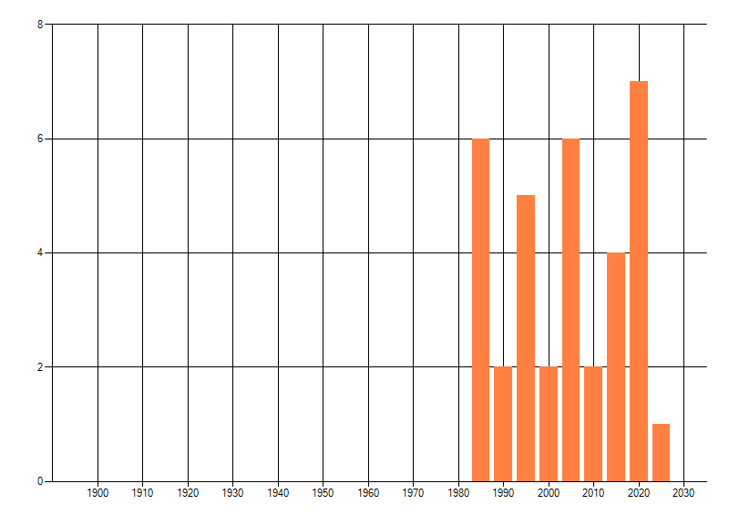 Het aantal atlasblokken (5x5 km) waarin de soort is gemeld binnen een periode van vijf jaar (vanaf 1980) of twintig jaar. Niet gecorrigeerd voor waarnemersinspanning en het aantal doorgegeven waarnemingen kan sterk variëren per periode, dus een trend in verspreiding kan hier niet direct uit worden afgelezen. Het opgegeven jaartal is het eerste jaar van de periode. Bron: gevalideerde waarnemingen uit de NDFF.