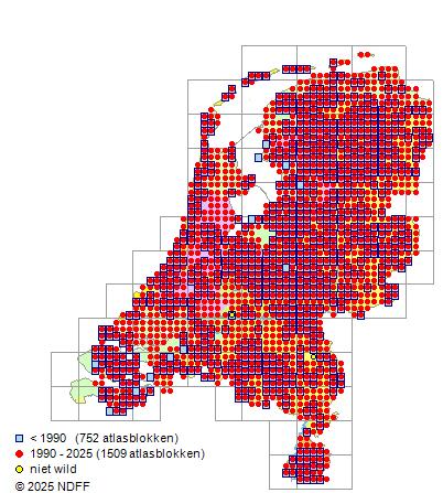 Het aantal atlasblokken (5x5 km) waarin de soort is gemeld binnen een periode van vijf jaar (vanaf 1980) of twintig jaar.