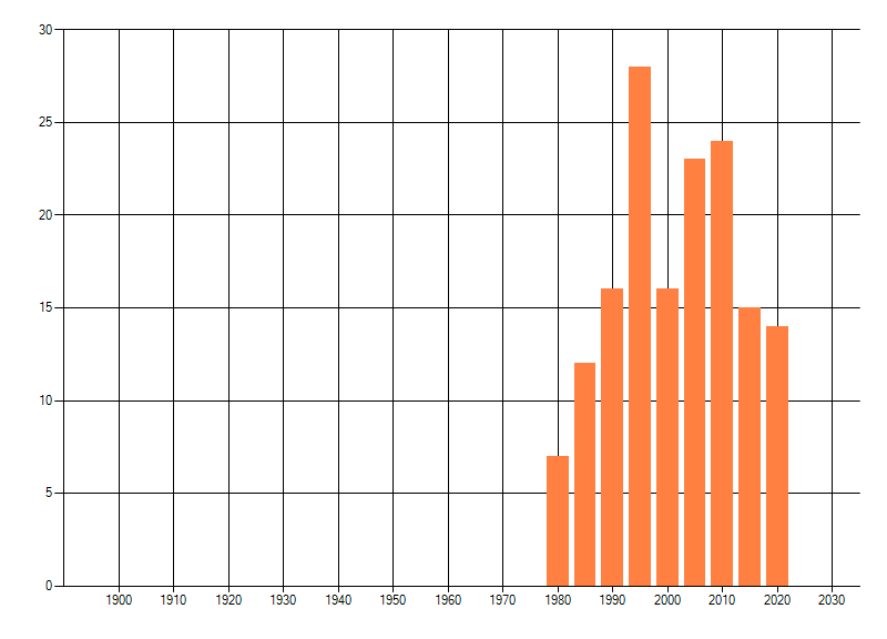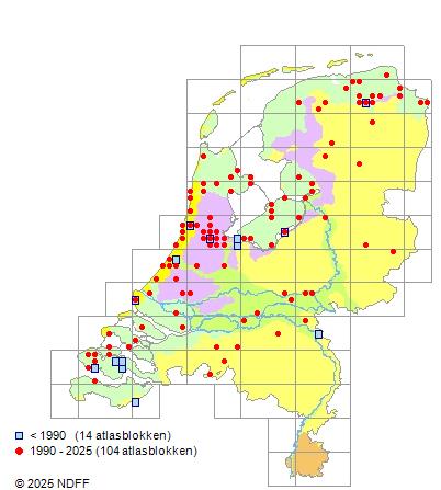 Het aantal atlasblokken (5x5 km) waarin de soort is gemeld binnen een periode van vijf jaar (vanaf 1980) of twintig jaar. Niet gecorrigeerd voor waarnemersinspanning en het aantal doorgegeven waarnemingen kan sterk variëren per periode, dus een trend in verspreiding kan hier niet direct uit worden afgelezen. Het opgegeven jaartal is het eerste jaar van de periode. Bron: gevalideerde waarnemingen uit de NDFF.