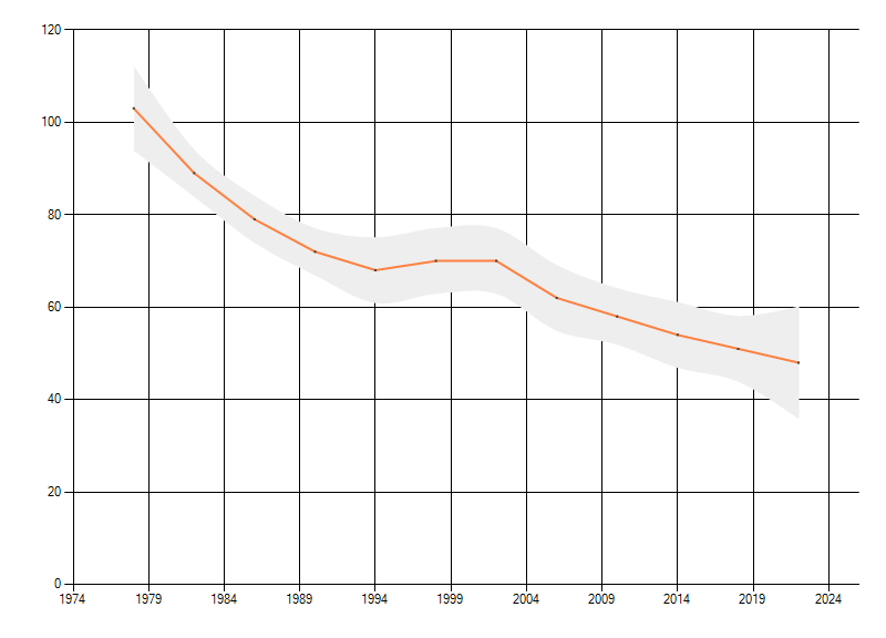 Gemiddelde trend van het aantal kilometerhokken waarin de soort voorkomt, weergegeven als indexcijfer (1975-1978 = 100). De trend is gecorrigeerd voor waarnemersinspanning en geeft de relatieve verandering in het aantal bezette kilometerhokken weer. Voor de berekening worden de data per periode van vier jaar samengenomen. In de grafiek correspondeert ieder punt met het laatste jaar van zo'n periode.