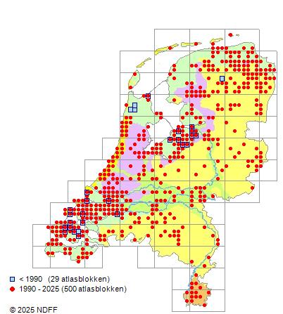 Het aantal atlasblokken (5x5 km) waarin de soort is gemeld binnen een periode van vijf jaar (vanaf 1980) of twintig jaar. Niet gecorrigeerd voor waarnemersinspanning en het aantal doorgegeven waarnemingen kan sterk variëren per periode, dus een trend in verspreiding kan hier niet direct uit worden afgelezen. Het opgegeven jaartal is het eerste jaar van de periode. Bron: gevalideerde waarnemingen uit de NDFF.