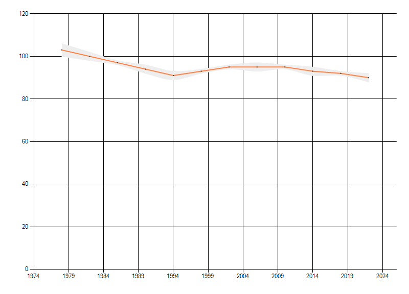 Gemiddelde trend van het aantal kilometerhokken waarin de soort voorkomt, weergegeven als indexcijfer (1975-1978 = 100). De trend is gecorrigeerd voor waarnemersinspanning en geeft de relatieve verandering in het aantal bezette kilometerhokken weer. Voor de berekening worden de data per periode van vier jaar samengenomen. In de grafiek correspondeert ieder punt met het laatste jaar van zo'n periode.