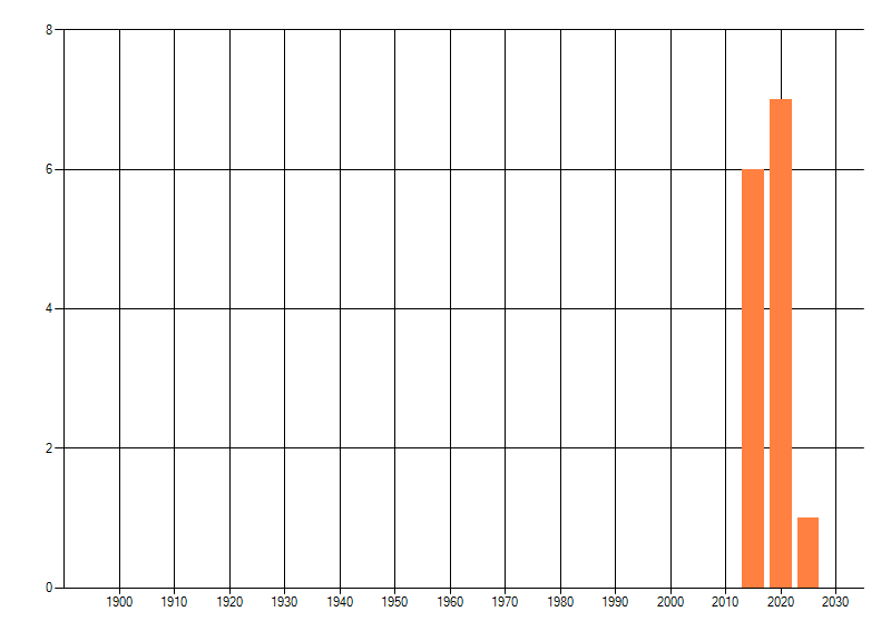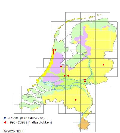 Het aantal atlasblokken (5x5 km) waarin de soort is gemeld binnen een periode van vijf jaar (vanaf 1980) of twintig jaar. Niet gecorrigeerd voor waarnemersinspanning en het aantal doorgegeven waarnemingen kan sterk variëren per periode, dus een trend in verspreiding kan hier niet direct uit worden afgelezen. Het opgegeven jaartal is het eerste jaar van de periode. Bron: gevalideerde waarnemingen uit de NDFF.