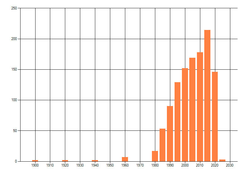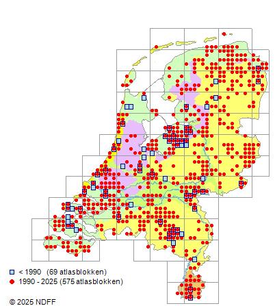 Het aantal atlasblokken (5x5 km) waarin de soort is gemeld binnen een periode van vijf jaar (vanaf 1980) of twintig jaar. Niet gecorrigeerd voor waarnemersinspanning en het aantal doorgegeven waarnemingen kan sterk variëren per periode, dus een trend in verspreiding kan hier niet direct uit worden afgelezen. Het opgegeven jaartal is het eerste jaar van de periode. Bron: gevalideerde waarnemingen uit de NDFF.
