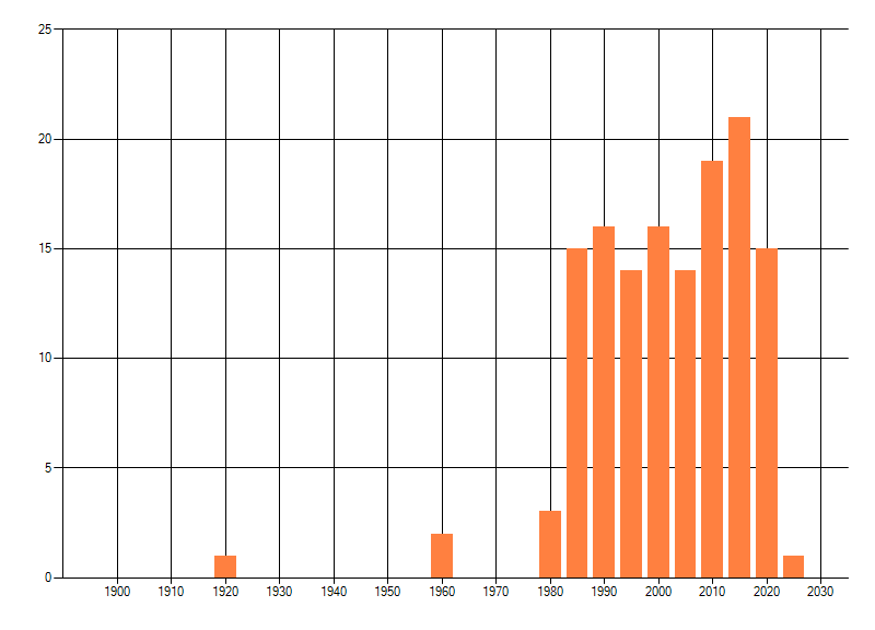 Het aantal atlasblokken (5x5 km) waarin de soort is gemeld binnen een periode van vijf jaar (vanaf 1980) of twintig jaar. Niet gecorrigeerd voor waarnemersinspanning en het aantal doorgegeven waarnemingen kan sterk variëren per periode, dus een trend in verspreiding kan hier niet direct uit worden afgelezen. Het opgegeven jaartal is het eerste jaar van de periode. Bron: gevalideerde waarnemingen uit de NDFF.