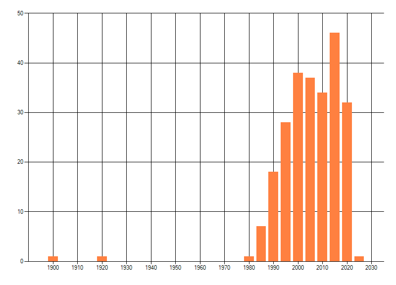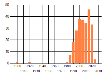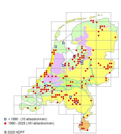 Het aantal atlasblokken (5x5 km) waarin de soort is gemeld binnen een periode van vijf jaar (vanaf 1980) of twintig jaar. Niet gecorrigeerd voor waarnemersinspanning en het aantal doorgegeven waarnemingen kan sterk variëren per periode, dus een trend in verspreiding kan hier niet direct uit worden afgelezen. Het opgegeven jaartal is het eerste jaar van de periode. Bron: gevalideerde waarnemingen uit de NDFF.