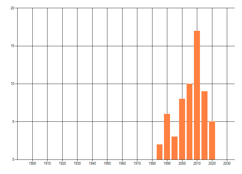 Het aantal atlasblokken (5x5 km) waarin de soort is gemeld binnen een periode van vijf jaar (vanaf 1980) of twintig jaar. Niet gecorrigeerd voor waarnemersinspanning en het aantal doorgegeven waarnemingen kan sterk variëren per periode, dus een trend in verspreiding kan hier niet direct uit worden afgelezen. Het opgegeven jaartal is het eerste jaar van de periode. Bron: gevalideerde waarnemingen uit de NDFF.