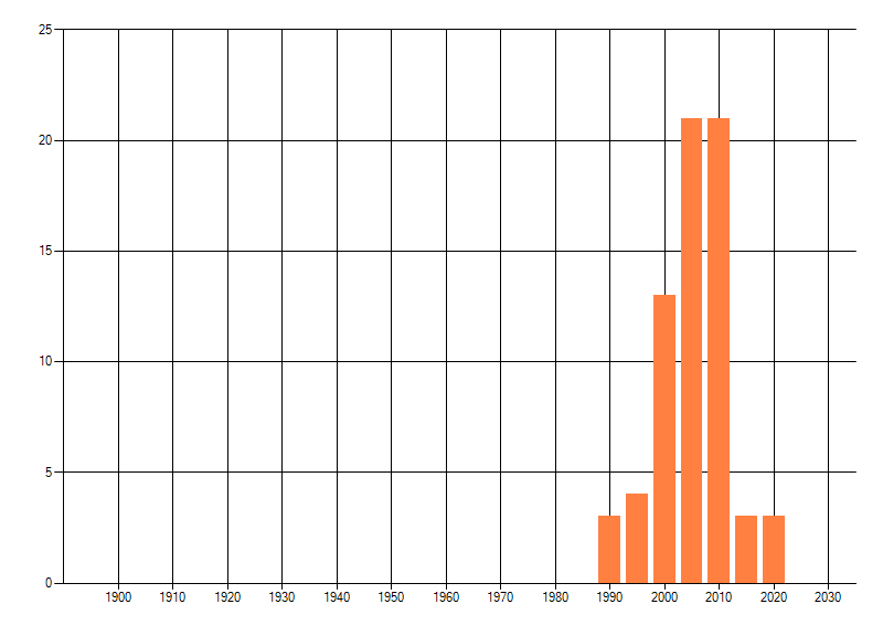 Het aantal atlasblokken (5x5 km) waarin de soort is gemeld binnen een periode van vijf jaar (vanaf 1980) of twintig jaar. Niet gecorrigeerd voor waarnemersinspanning en het aantal doorgegeven waarnemingen kan sterk variëren per periode, dus een trend in verspreiding kan hier niet direct uit worden afgelezen. Het opgegeven jaartal is het eerste jaar van de periode. Bron: gevalideerde waarnemingen uit de NDFF.