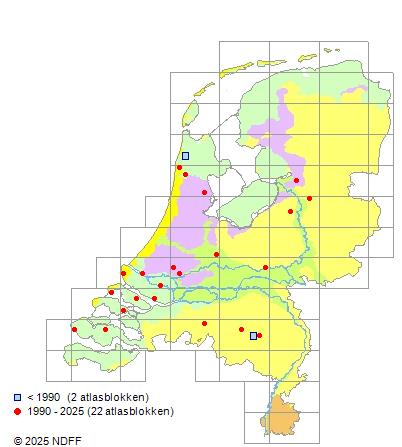 Het aantal atlasblokken (5x5 km) waarin de soort is gemeld binnen een periode van vijf jaar (vanaf 1980) of twintig jaar. Niet gecorrigeerd voor waarnemersinspanning en het aantal doorgegeven waarnemingen kan sterk variëren per periode, dus een trend in verspreiding kan hier niet direct uit worden afgelezen. Het opgegeven jaartal is het eerste jaar van de periode. Bron: gevalideerde waarnemingen uit de NDFF.