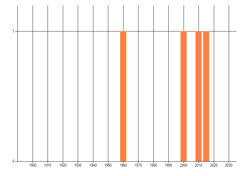 Het aantal atlasblokken (5x5 km) waarin de soort is gemeld binnen een periode van vijf jaar (vanaf 1980) of twintig jaar. Niet gecorrigeerd voor waarnemersinspanning en het aantal doorgegeven waarnemingen kan sterk variëren per periode, dus een trend in verspreiding kan hier niet direct uit worden afgelezen. Het opgegeven jaartal is het eerste jaar van de periode. Bron: gevalideerde waarnemingen uit de NDFF.
