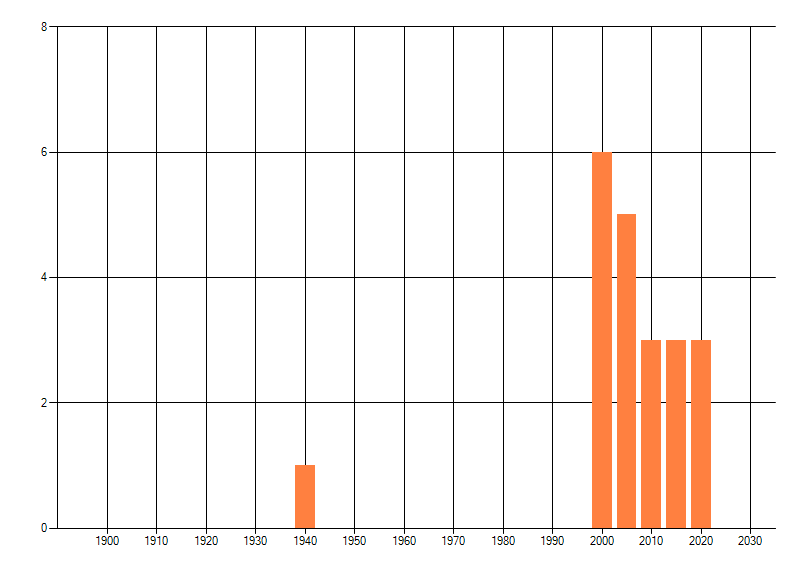 Het aantal atlasblokken (5x5 km) waarin de soort is gemeld binnen een periode van vijf jaar (vanaf 1980) of twintig jaar. Niet gecorrigeerd voor waarnemersinspanning en het aantal doorgegeven waarnemingen kan sterk variëren per periode, dus een trend in verspreiding kan hier niet direct uit worden afgelezen. Het opgegeven jaartal is het eerste jaar van de periode. Bron: gevalideerde waarnemingen uit de NDFF.
