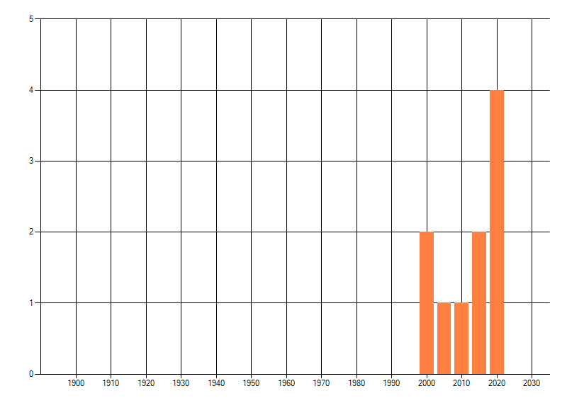 Het aantal atlasblokken (5x5 km) waarin de soort is gemeld binnen een periode van vijf jaar (vanaf 1980) of twintig jaar. Niet gecorrigeerd voor waarnemersinspanning en het aantal doorgegeven waarnemingen kan sterk variëren per periode, dus een trend in verspreiding kan hier niet direct uit worden afgelezen. Het opgegeven jaartal is het eerste jaar van de periode. Bron: gevalideerde waarnemingen uit de NDFF.