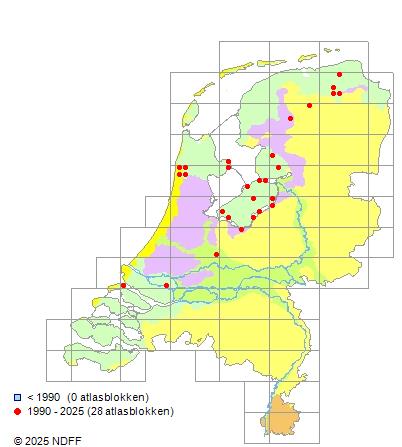 Het aantal atlasblokken (5x5 km) waarin de soort is gemeld binnen een periode van vijf jaar (vanaf 1980) of twintig jaar. Niet gecorrigeerd voor waarnemersinspanning en het aantal doorgegeven waarnemingen kan sterk variëren per periode, dus een trend in verspreiding kan hier niet direct uit worden afgelezen. Het opgegeven jaartal is het eerste jaar van de periode. Bron: gevalideerde waarnemingen uit de NDFF.