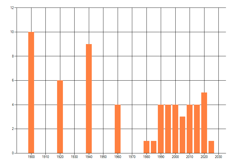 Het aantal atlasblokken (5x5 km) waarin de soort is gemeld binnen een periode van vijf jaar (vanaf 1980) of twintig jaar. Niet gecorrigeerd voor waarnemersinspanning en het aantal doorgegeven waarnemingen kan sterk variëren per periode, dus een trend in verspreiding kan hier niet direct uit worden afgelezen. Het opgegeven jaartal is het eerste jaar van de periode. Bron: gevalideerde waarnemingen uit de NDFF.