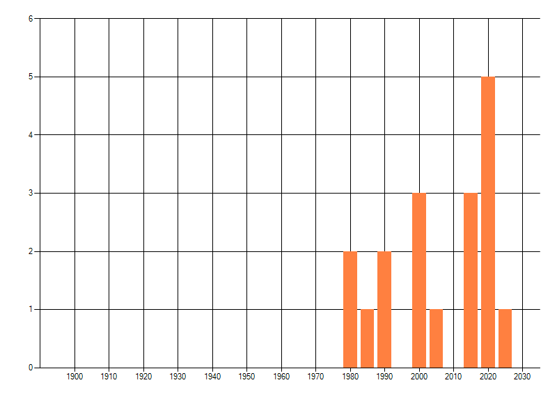 Het aantal atlasblokken (5x5 km) waarin de soort is gemeld binnen een periode van vijf jaar (vanaf 1980) of twintig jaar. Niet gecorrigeerd voor waarnemersinspanning en het aantal doorgegeven waarnemingen kan sterk variëren per periode, dus een trend in verspreiding kan hier niet direct uit worden afgelezen. Het opgegeven jaartal is het eerste jaar van de periode. Bron: gevalideerde waarnemingen uit de NDFF.