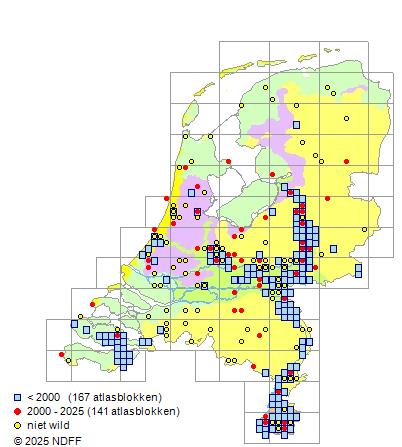 CC BY-NC-SA 3.0 NLVerspreidingNederlandZeldzaam in Zuid-Limburg en zeer zeldzaam of uitgestorven in het oostelijke rivierengebied. Vroeger ook op Zuid-Beveland en in oostelijk Zeeuwsch-Vlaanderen.