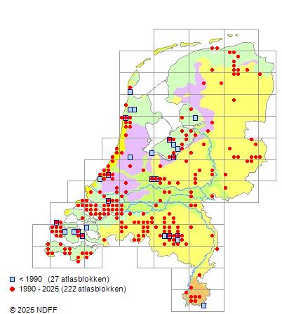 Het aantal atlasblokken (5x5 km) waarin de soort is gemeld binnen een periode van vijf jaar (vanaf 1980) of twintig jaar. Niet gecorrigeerd voor waarnemersinspanning en het aantal doorgegeven waarnemingen kan sterk variëren per periode, dus een trend in verspreiding kan hier niet direct uit worden afgelezen. Het opgegeven jaartal is het eerste jaar van de periode. Bron: gevalideerde waarnemingen uit de NDFF.