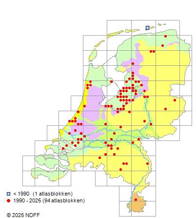 Het aantal atlasblokken (5x5 km) waarin de soort is gemeld binnen een periode van vijf jaar (vanaf 1980) of twintig jaar. Niet gecorrigeerd voor waarnemersinspanning en het aantal doorgegeven waarnemingen kan sterk variëren per periode, dus een trend in verspreiding kan hier niet direct uit worden afgelezen. Het opgegeven jaartal is het eerste jaar van de periode. Bron: gevalideerde waarnemingen uit de NDFF.