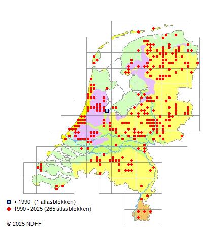 Het aantal atlasblokken (5x5 km) waarin de soort is gemeld binnen een periode van vijf jaar (vanaf 1980) of twintig jaar. Niet gecorrigeerd voor waarnemersinspanning en het aantal doorgegeven waarnemingen kan sterk variëren per periode, dus een trend in verspreiding kan hier niet direct uit worden afgelezen. Het opgegeven jaartal is het eerste jaar van de periode. Bron: gevalideerde waarnemingen uit de NDFF.
