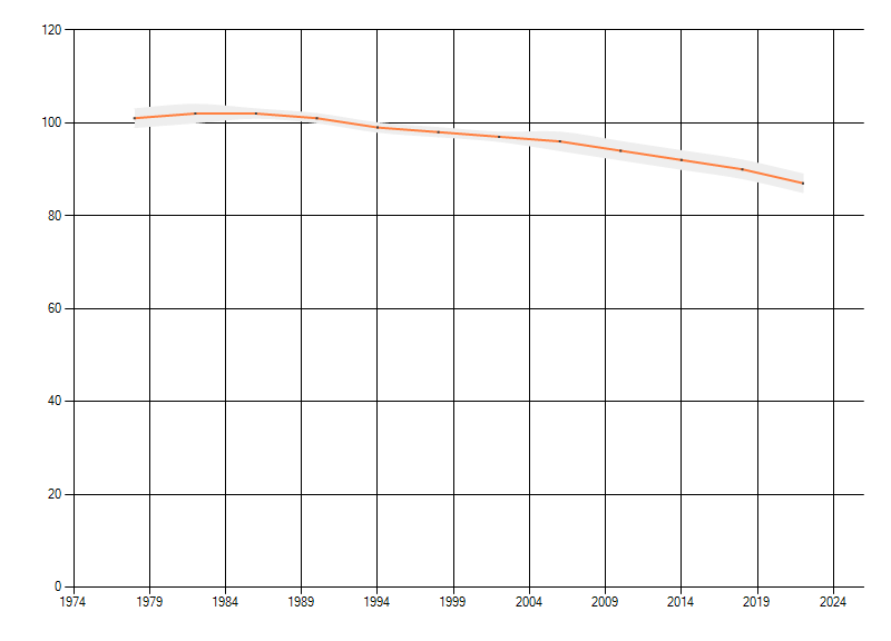 Gemiddelde trend van het aantal kilometerhokken waarin de soort voorkomt, weergegeven als indexcijfer (1975-1978 = 100). De trend is gecorrigeerd voor waarnemersinspanning en geeft de relatieve verandering in het aantal bezette kilometerhokken weer. Voor de berekening worden de data per periode van vier jaar samengenomen. In de grafiek correspondeert ieder punt met het laatste jaar van zo'n periode.