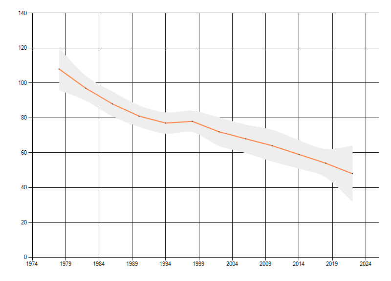 Gemiddelde trend van het aantal kilometerhokken waarin de soort voorkomt, weergegeven als indexcijfer (1975-1978 = 100).