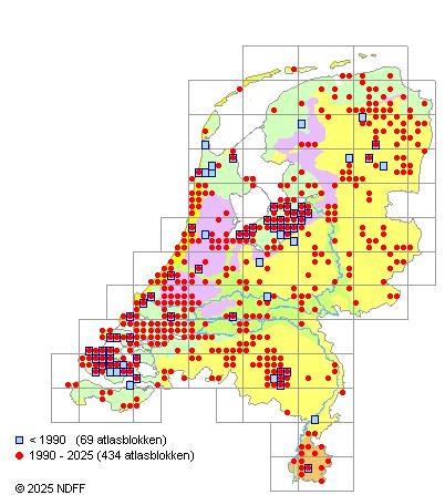 Het aantal atlasblokken (5x5 km) waarin de soort is gemeld binnen een periode van vijf jaar (vanaf 1980) of twintig jaar. Niet gecorrigeerd voor waarnemersinspanning en het aantal doorgegeven waarnemingen kan sterk variëren per periode, dus een trend in verspreiding kan hier niet direct uit worden afgelezen. Het opgegeven jaartal is het eerste jaar van de periode. Bron: gevalideerde waarnemingen uit de NDFF.