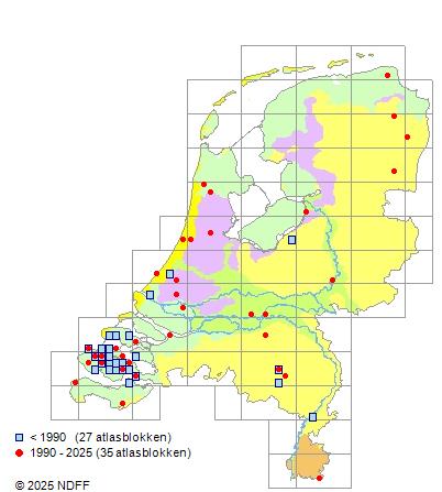 Het aantal atlasblokken (5x5 km) waarin de soort is gemeld binnen een periode van vijf jaar (vanaf 1980) of twintig jaar. Niet gecorrigeerd voor waarnemersinspanning en het aantal doorgegeven waarnemingen kan sterk variëren per periode, dus een trend in verspreiding kan hier niet direct uit worden afgelezen. Het opgegeven jaartal is het eerste jaar van de periode. Bron: gevalideerde waarnemingen uit de NDFF.
