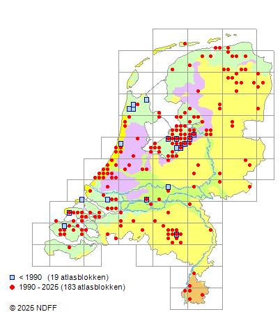 Het aantal atlasblokken (5x5 km) waarin de soort is gemeld binnen een periode van vijf jaar (vanaf 1980) of twintig jaar. Niet gecorrigeerd voor waarnemersinspanning en het aantal doorgegeven waarnemingen kan sterk variëren per periode, dus een trend in verspreiding kan hier niet direct uit worden afgelezen. Het opgegeven jaartal is het eerste jaar van de periode. Bron: gevalideerde waarnemingen uit de NDFF.