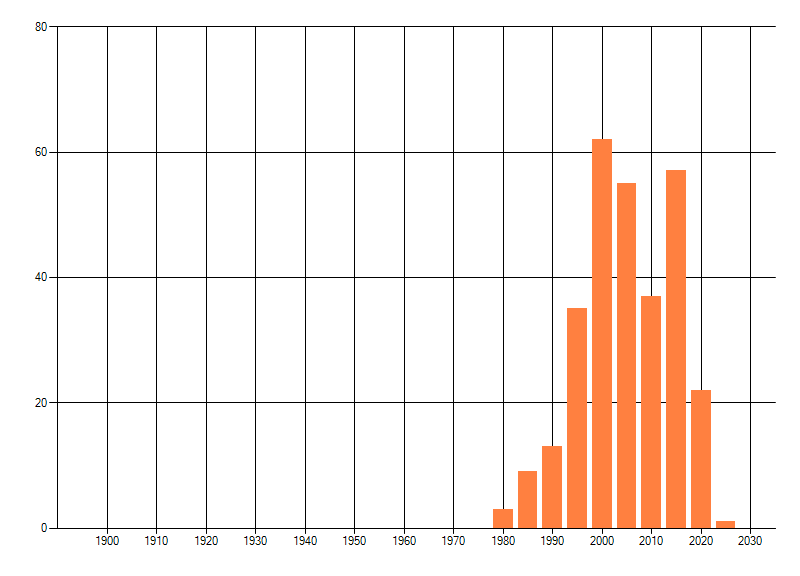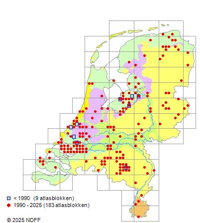 Het aantal atlasblokken (5x5 km) waarin de soort is gemeld binnen een periode van vijf jaar (vanaf 1980) of twintig jaar. Niet gecorrigeerd voor waarnemersinspanning en het aantal doorgegeven waarnemingen kan sterk variëren per periode, dus een trend in verspreiding kan hier niet direct uit worden afgelezen. Het opgegeven jaartal is het eerste jaar van de periode. Bron: gevalideerde waarnemingen uit de NDFF.
